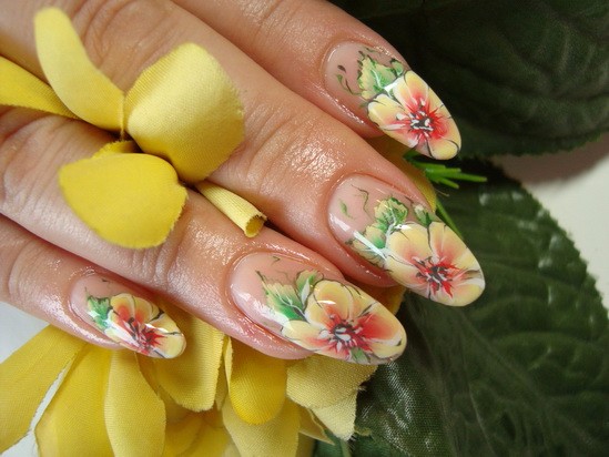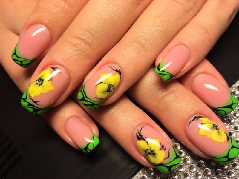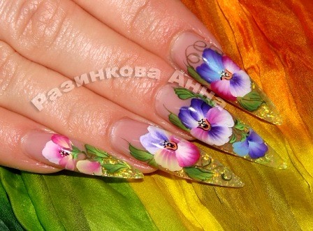 Такой маникюр отлично подойдет для любого рода праздничных мероприятий. Он создается при помощи гелей и цветной акриловой пудры. На ноготь налепливаются различные цветы (ромашки, васильки, розы) и представители фауны (жучки, паучки).